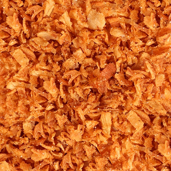 Его можно добавлять при замешивании теста для хлеба, использовать в качестве панировки. Жареный лук широко применяется в качестве добавки для фастфуда, в хот-догах, гамбургерах, сэндвичах, бутербродах и в блюдах быстрого приготовления. Его можно добавлять в салаты и закуски.